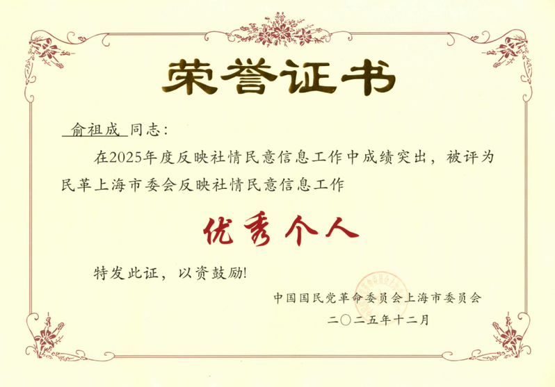 民革上海外国语大学支部副主委、国际关系与公共事务学院教授俞祖成荣获“民革上海市委会2025年度反映社情民意信息工作优秀个人”。