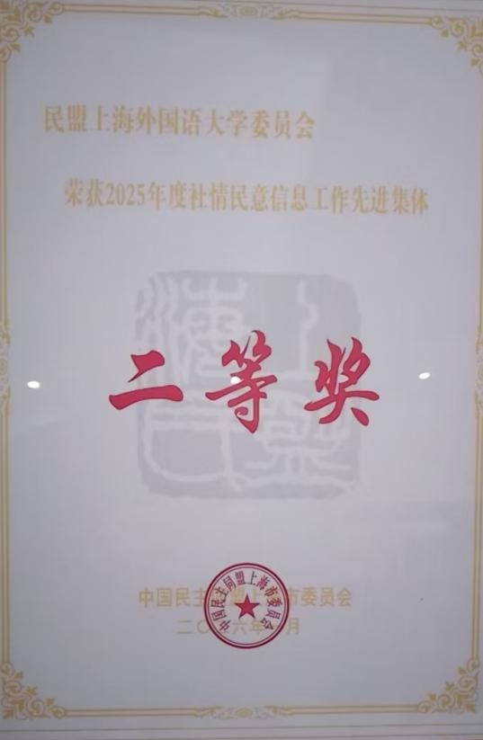 会议对2025年度盟务工作先进集体、先进个人进行表彰。民盟上海外国语大学委员会荣获“2025年度民盟上海市委社情民意信息工作先进集体二等奖”。
