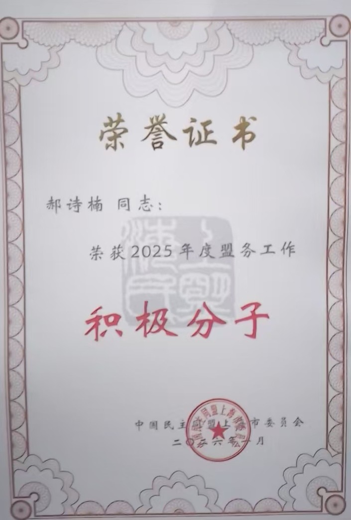 民盟上海外国语大学副主委郝诗楠荣获“2025年度盟务工作积极分子”。