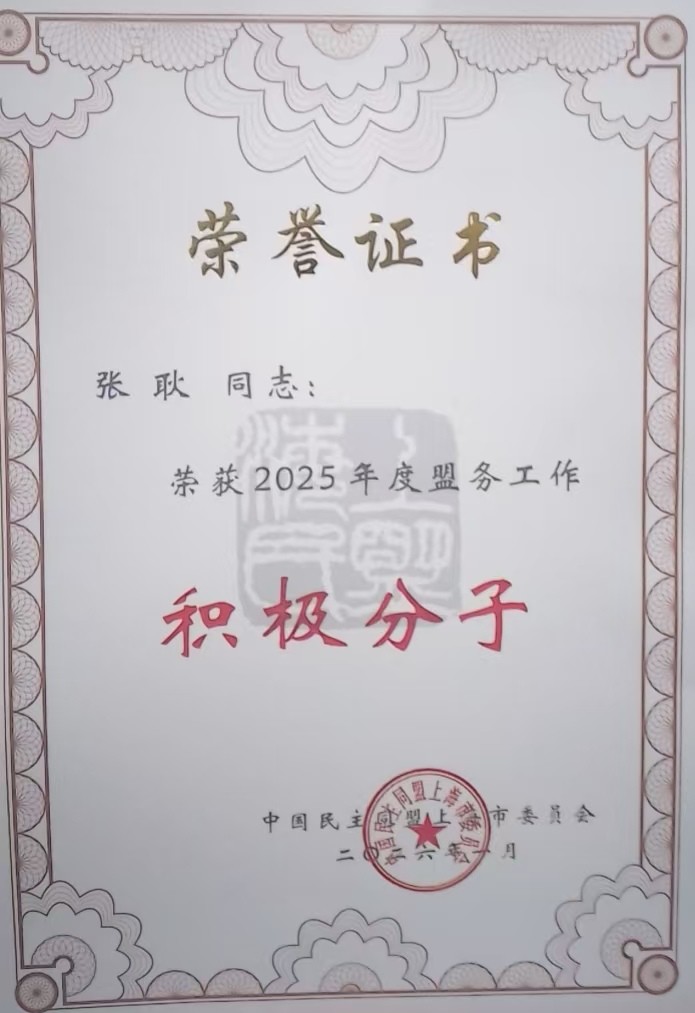 民盟上海外国语大学主委张耿荣获“2025年度盟务工作积极分子”。