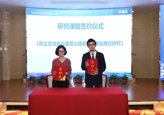 民革市委会理论文史委副主任俞平和上海外国语大学(全球)城市基层治理研究中心副主任郝诗楠分别代表两机构签署研究课题合作协议。双方将历时三年,就“民主党派参与基层治理现代化建设路径”课题联合开展研究。