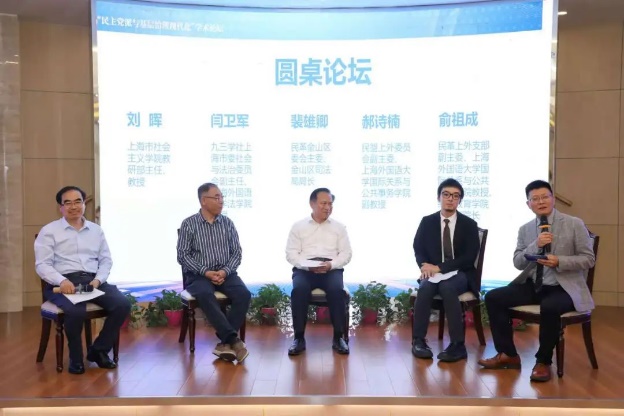 “民主党派参与基层治理现代化的三个维度——在场,助力,奔赴”。圆桌论坛气氛热烈,上海市社会主义学院教研部主任、教授刘晖,九三学社上海市委社会与法治委员会副主任、上海外国语大学法学院教授闫卫军,民革金山区委会主委、金山区司法局局长裴雄卿,民盟上海外国语大学委员会副主委、国际关系与公共事务学院副教授郝诗楠及俞祖成分别围绕城市基层治理组织改革的设想,民主党派与基层治理现代化的关系,结合个人工作实践,分享对民主党派与基层治理现代化关系的认识。