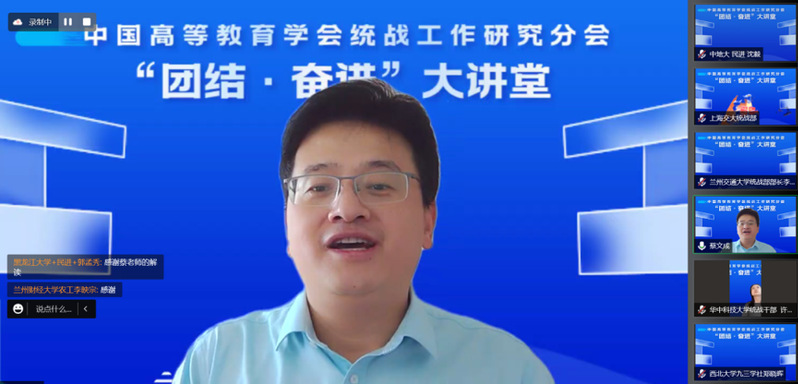 为深入学习宣传党的二十大精神,贯彻落实习近平总书记关于做好新时代党的统一战线工作的重要思想,10月24日下午,中国高等教育学会统战工作研究分会线上举办了“团结·奋进”大讲堂第二期,邀请国家级人才计划哲学社会科学领军人才、兰州大学马克思主义学院院长蔡文成教授作题为《领航新时代 奋进新征程——深入学习宣传贯彻党的二十大精神》的专题辅导报告。会员单位统战干部、党外代表人士1800余人参加了报告会。我校党委统战部、各民主党派和无党派代表人士线上参加学习。