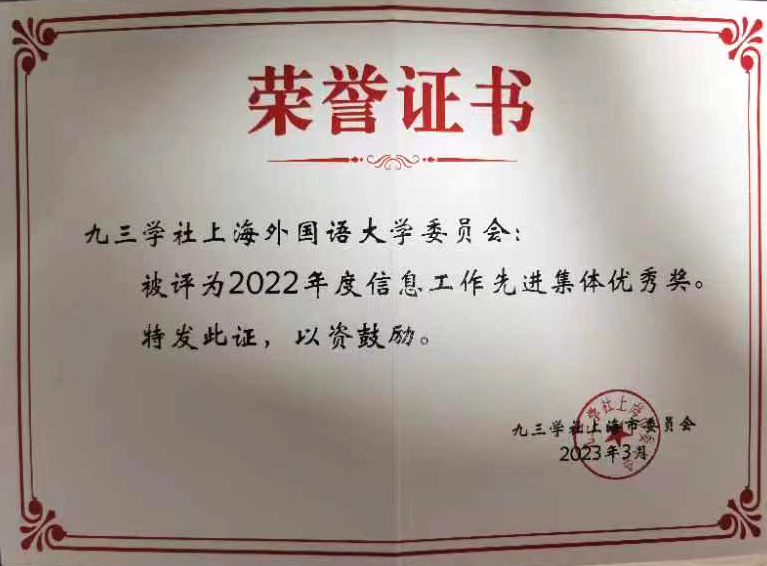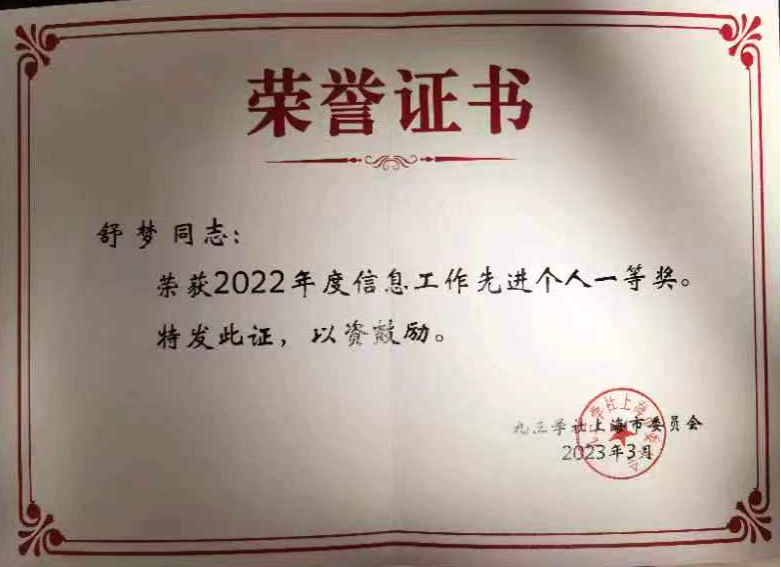 九三学社上外委员会荣获2022年度信息工作先进集体优秀奖,委员舒梦荣获2022年度信息工作先进个人一等奖。