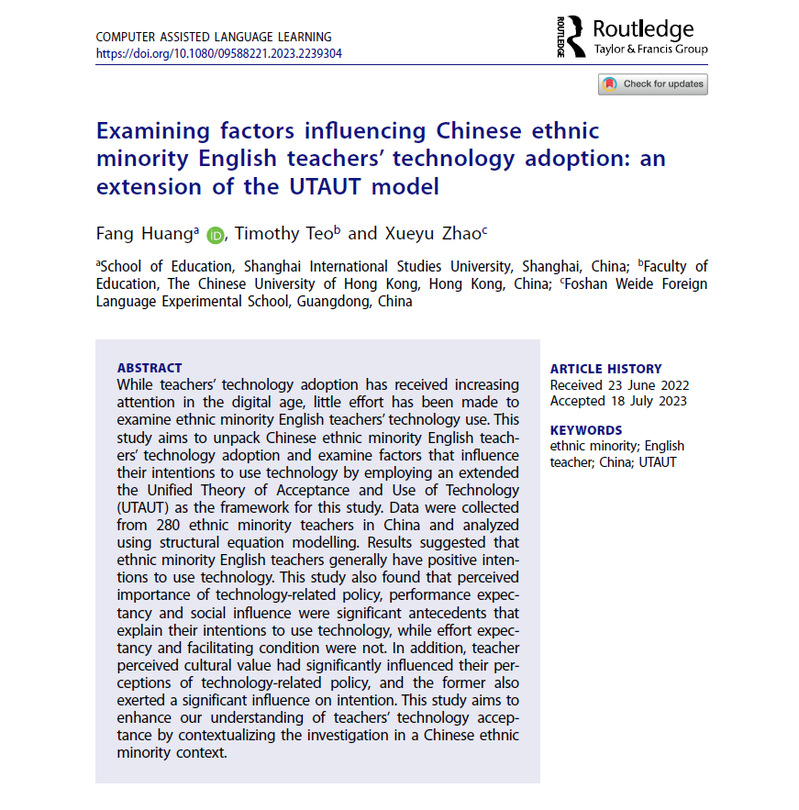由上外国际教育学院、致公党上外支部委员会黄芳教授撰写的学术论文Examining factors influence Chinese ethnic minority English teachers’ technology adoption: An extension of the UTAUT model,发表于语言学、教育学双检索的国际知名学术期刊Computer Assisted Language Learning(影响因子7.0,语言学、教育学SSCI一区)。该研究创新性地将跨文化理论与技术相关理论相结合,采用结构方程模型这一高级量化方法探究了我国少数民族英语教师技术使用的影响因素。研究发现:我国少数民族英语教师的技术使用受到工作效果期望、努力期望、主观规范、设备及技术支持条件、智慧教育政策以及价值观等多重因素的影响,明确了少数民族英语教师技术赋能英语教学的心理机制。