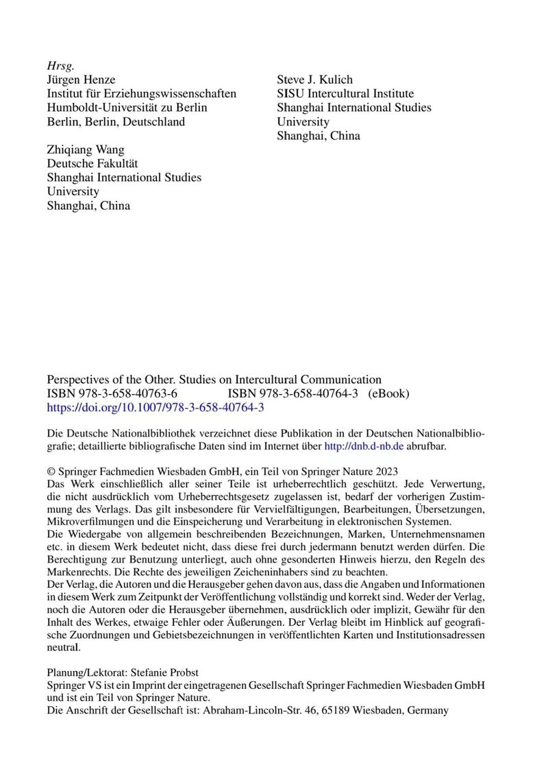 近日,德国洪堡大学教育学系Jürgen Henze教授、上海外国语大学跨文化中心顾力行教授和德语系王志强教授(无党派人士、上外知联会会长)共同主编的新书《跨文化交际和跨文化能力德国和中国视角的研究》由德国Springer VS出版社出版。