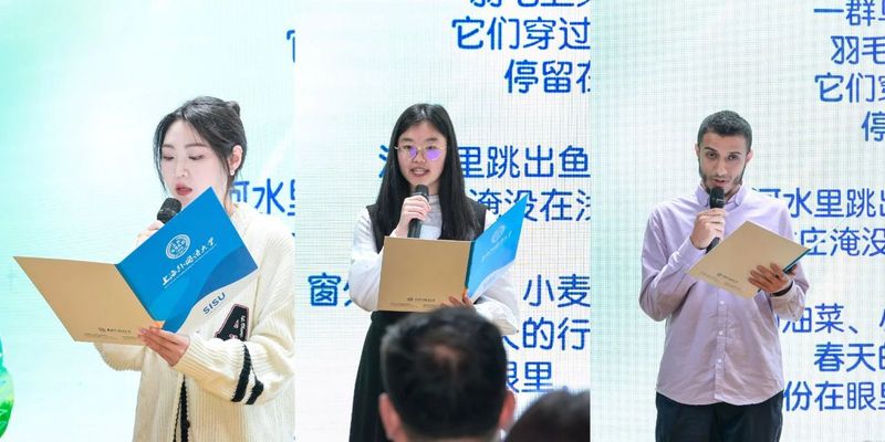 来自上海外国语大学的师生用朝鲜语、阿拉伯语、英语等语言朗诵了诗歌《泖港的春天》。