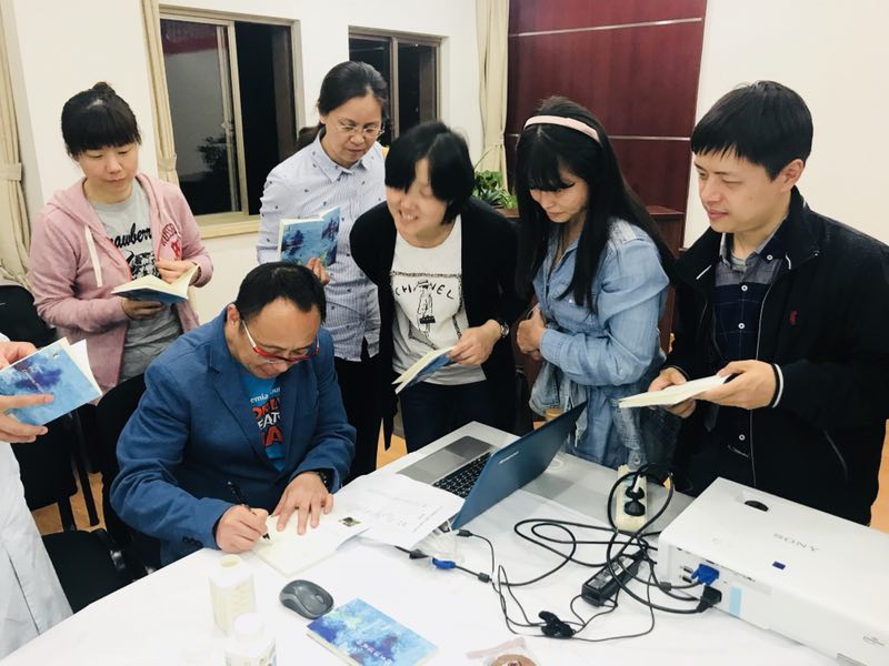 杨辉老师从自身经验出发,分享了最初创作英语诗歌的灵感。他认为,每个人都可以从不同的角度诠释对生活的领悟。他喜欢把生活中发生的故事、看到的新闻轶事写下来,记录生活的点滴和感悟。他的诗歌从不同的角度诠释生活的方方面面:情感、诚信、激励、学习等,积极传达正能量,及时反映社会的时讯和精神。目前,杨辉老师已创作英文诗歌近400首,其中精选127首集结成册《把生活过成诗》,由译文出版社发行出版。讲座中,杨辉老师推荐了英语学习网站,提出行之有效的词汇的运用及押韵,并耐心回答了医护人员提出的各种问题。他指出,医生每天遇到各类病人,所见所闻是很好的文学素材。他建议各位医生养成Do it now的习惯,不要患拖延症。最后,杨辉老师朗读了一首诗歌,鼓励医生成为未来的诗人。只要心存梦想,每个人都能成为诗人,讲座结束时杨辉老师向与会者赠送了他的英语诗集。