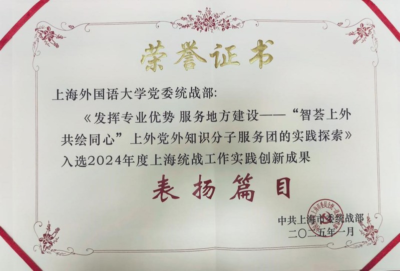 上海外国语大学党委统战部申报的研究项目《发挥专业优势 服务地方建设——“智荟上外 共绘同心”上外党外知识分子服务团的实践探索》入选2024年度上海统战工作实践创新成果表扬篇目。