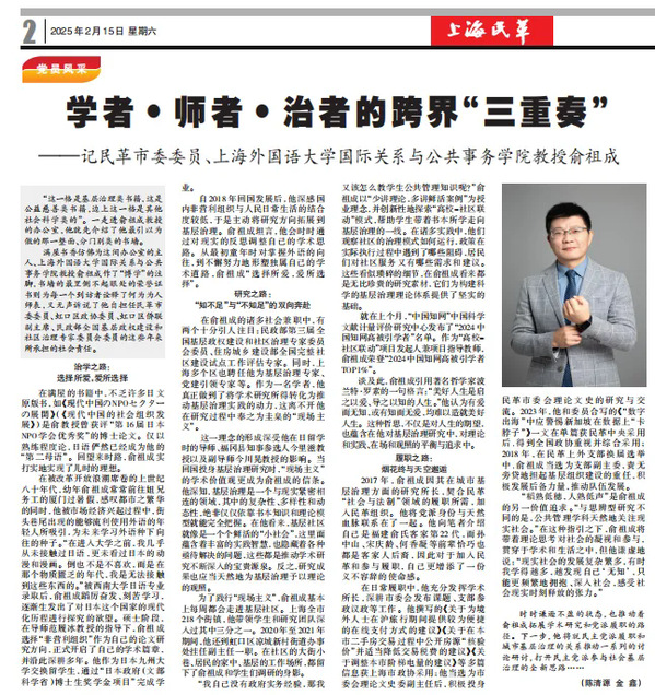 2018年回国发展后,他深感国内非营利组织与人民日常生活的结合度较低,于是主动将研究方向拓展到基层治理。俞祖成坦言,他会时时通过对现实的反思调整自己的学术思路。从最初童年时对掌握外语的向往,到不懈努力地形塑独属自己的学术道路,俞祖成“选择所爱,爱所选择”。
